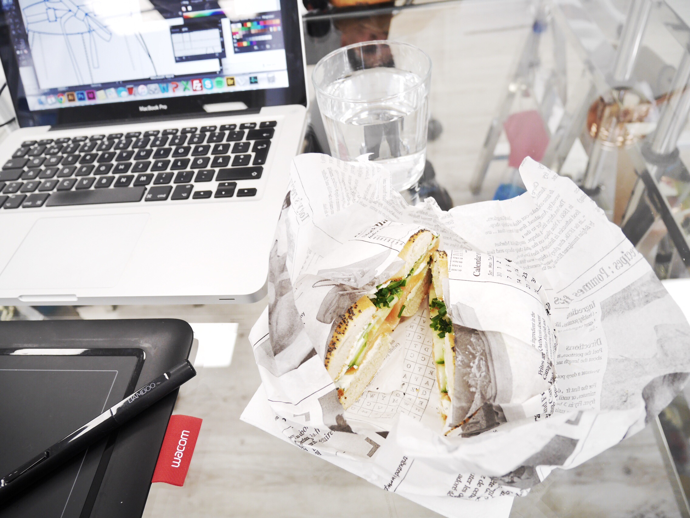 On a quick lunchbreak here in the studio at Jacqueline Coq where I intern. Today’s lunch was a yummy bagel from Oh My Cake, just around the corner. It’s a full on storm here in Paris today with hail and rain so you do not want to go on a huge food search.